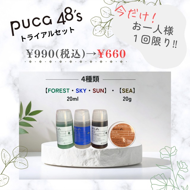 puca48シリーズ トライアル4点SET 内容量:20ml(FOREST、SUN、SKY、SEA) プーカ48シリーズのお試しサイズです。シリコン・鉱物油不使用、髪や地肌にやさしいシャンプーとトリートメントのセットです。